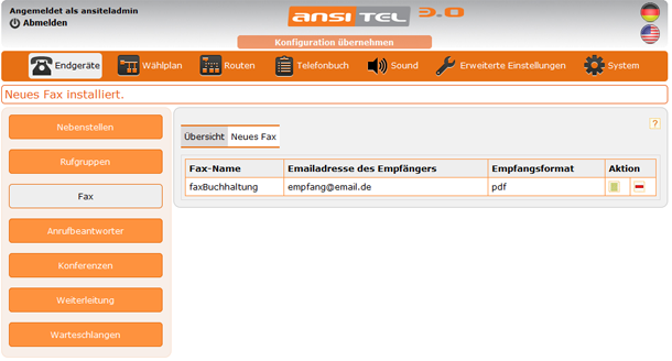 Sie haben ein Fax eingerichtet. Wenn Sie die Konfiguration übernehmen, wird das Fax im System eingericht. Dazu klicken Sie auf das rot unterlegte Konfiguration übernehmen'